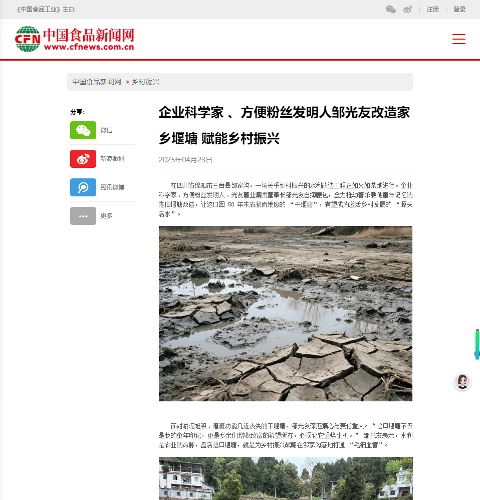 轉(zhuǎn)載中國食品新聞網(wǎng)——企業(yè)科學(xué)家 、方便粉絲發(fā)明人鄒光友改造家鄉(xiāng)堰塘 賦能鄉(xiāng)村振興
