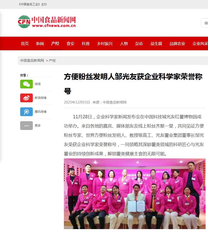 轉載中國食品新聞網-方便粉絲發(fā)明人鄒光友獲《企業(yè)科學家》榮譽稱號