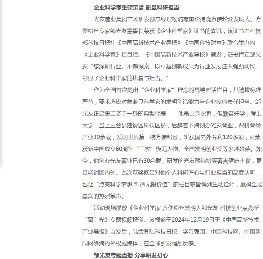 方便粉絲發(fā)明人鄒光友獲企業(yè)科學家榮譽稱號
